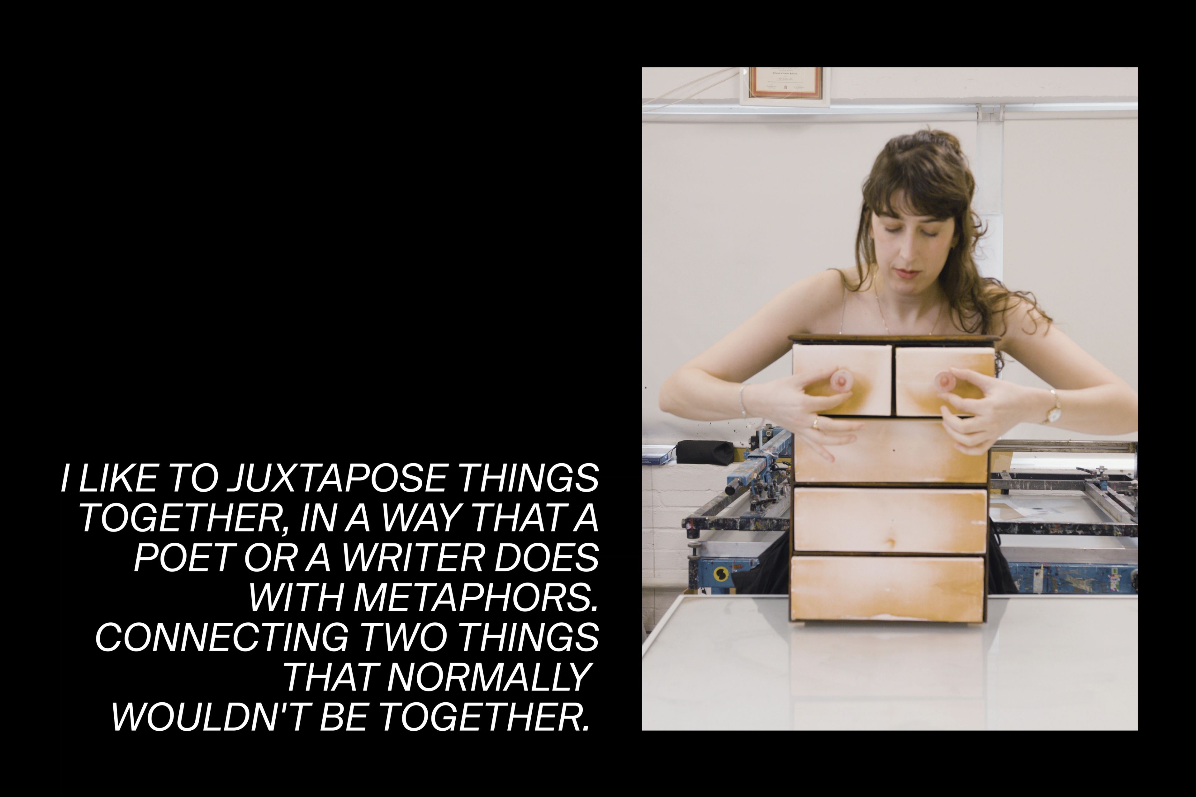 A multi-disciplinary artist, she uses her body as a subject to film and draw, but also to deconstruct, collage, and morph into sculpture: telling feminine stories that question the status quo and subtly disrupt systemic patriarchal conditioning.
