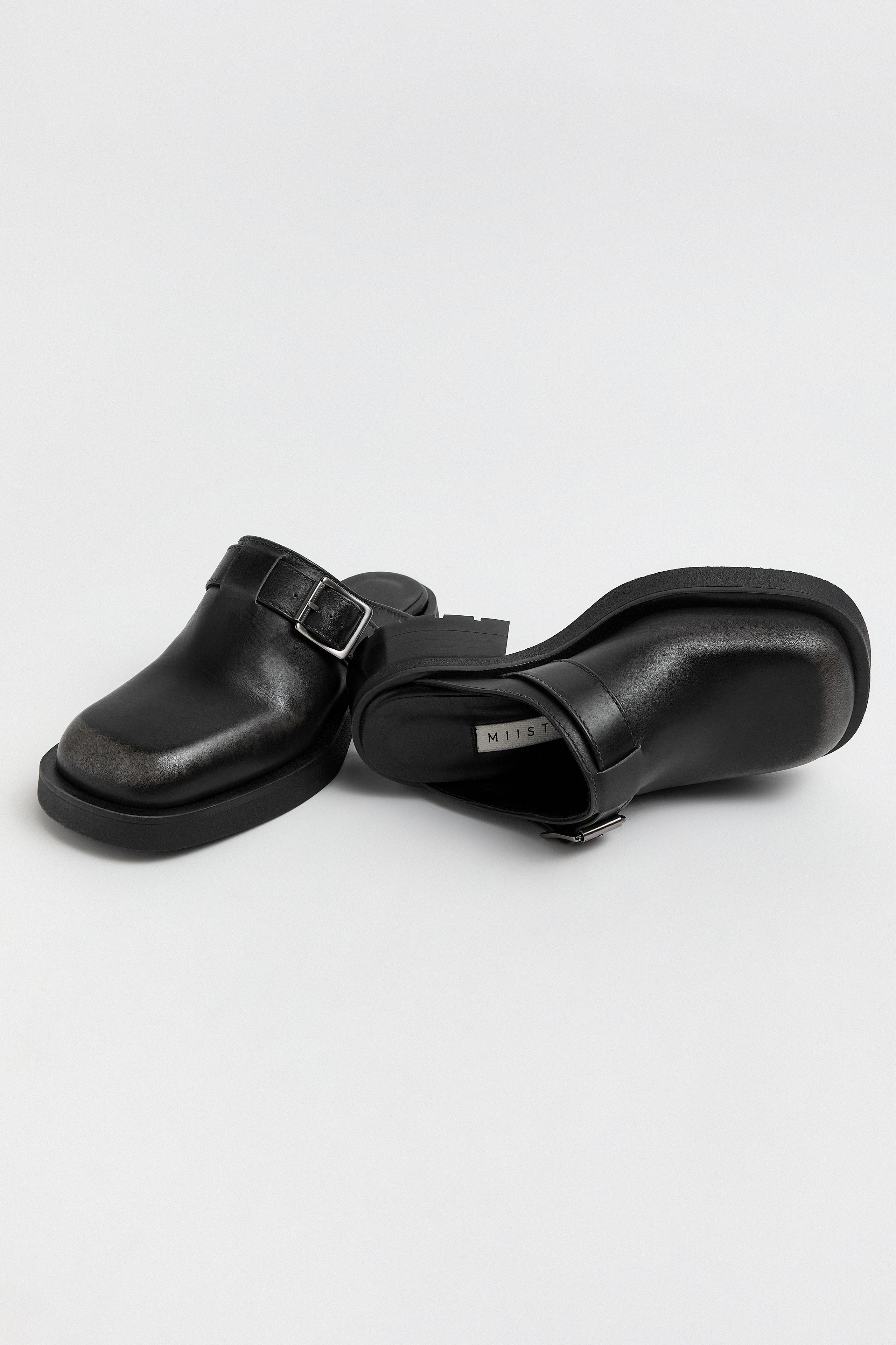 Aroa is a mule that takes its design cues from biker boots. Sturdy, square-toed, with a buckle, a thick rubber sole and stacked effect flared heel. The mule comes crafted in a grey, brush-off effect, double tanned leather that will reveal the lighter grey colour beneath as they are worn.
