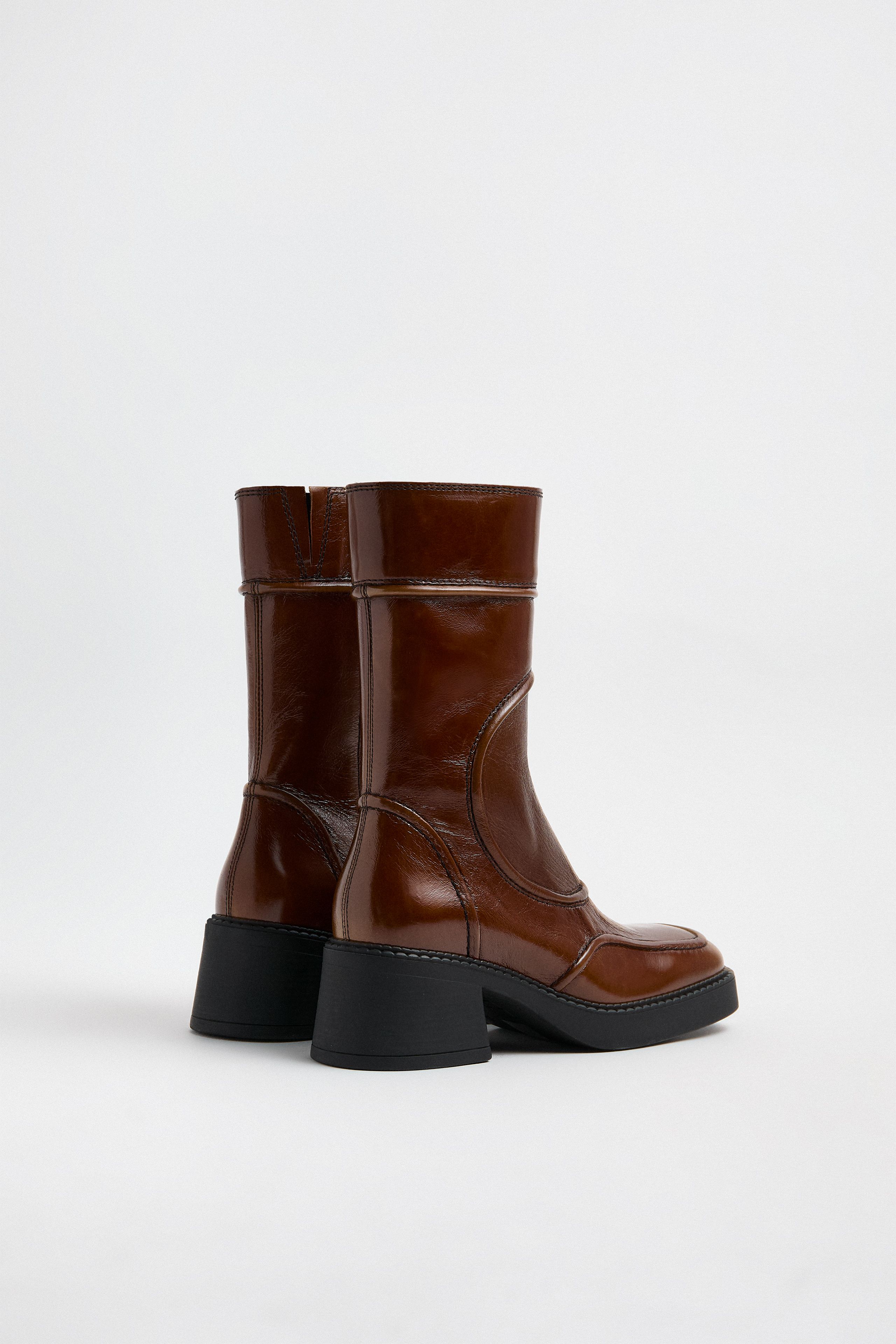 Malene is a military-style panelled ankle boot in a tan crinkle patent eather with a square toe, oversized black rubber sole, and stacked effect flared heel. The design features tonal stitching over a distinctive loop-and-line pattern, with internal piping that creates its characteristic raised lines. There's an inside zip and a discreet elastic dart to accommodate individual fit.