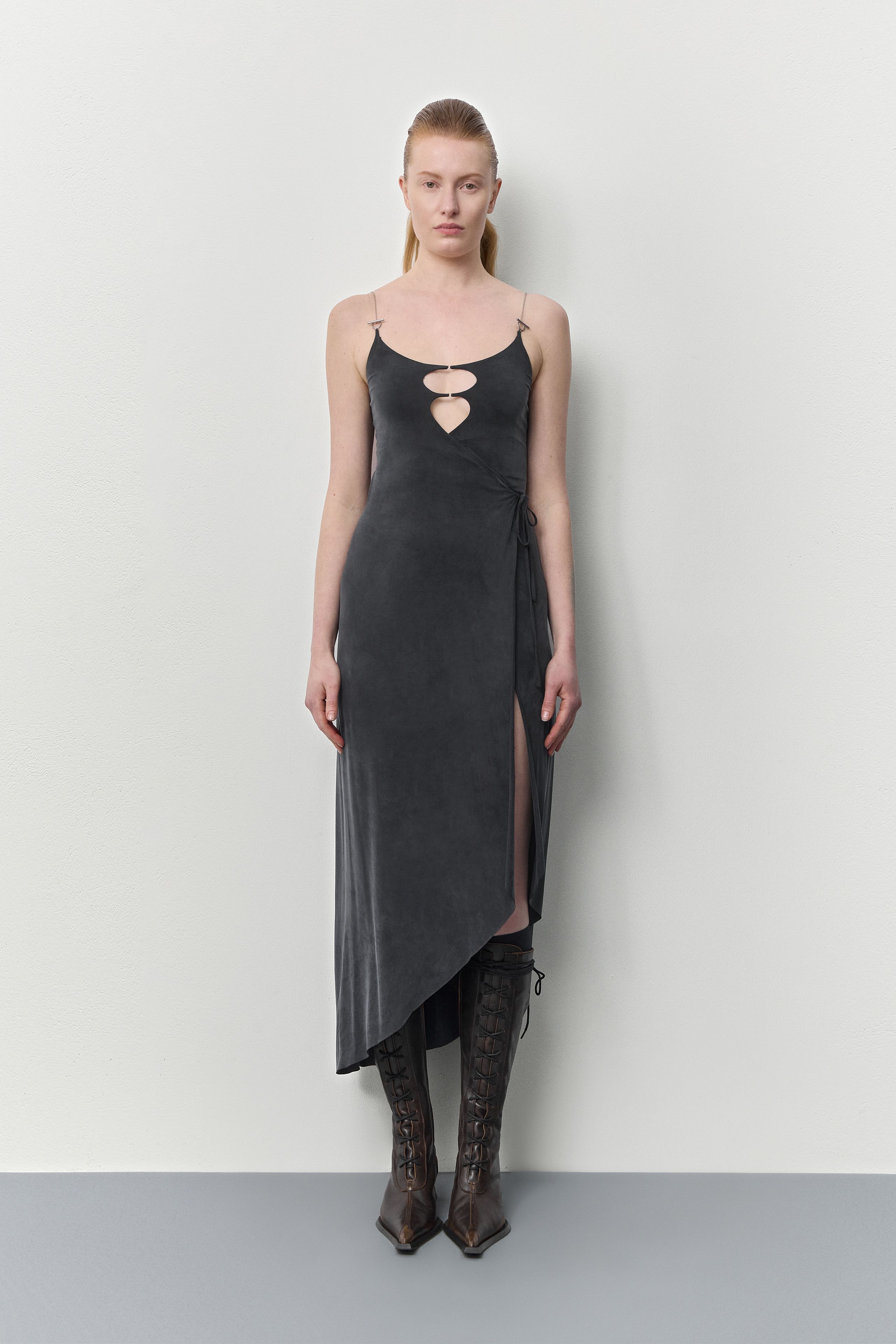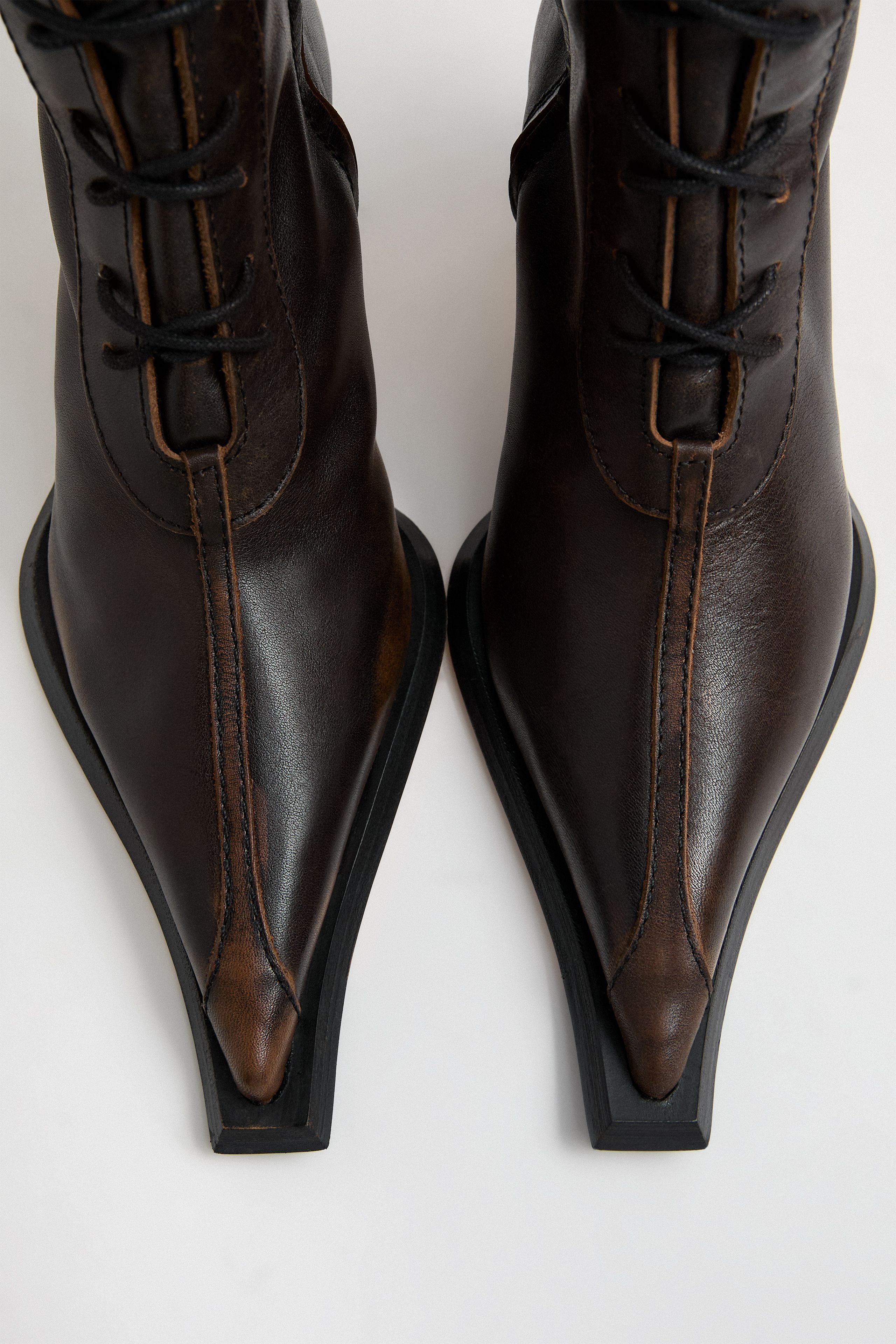 Ambika is tall, fitted boot with a decorative slim panelled design down the pointed toe, an outsized beak-shaped sole and a slim sculpted 6 cm heel. The design features a corsetry-inspired lattice of laces that runs all the way down the front of boots, with extra-long laces to wrap around the top and is crafted in a brown brush-off effect leather that gives every pair a distinct double tanned patina beneath.