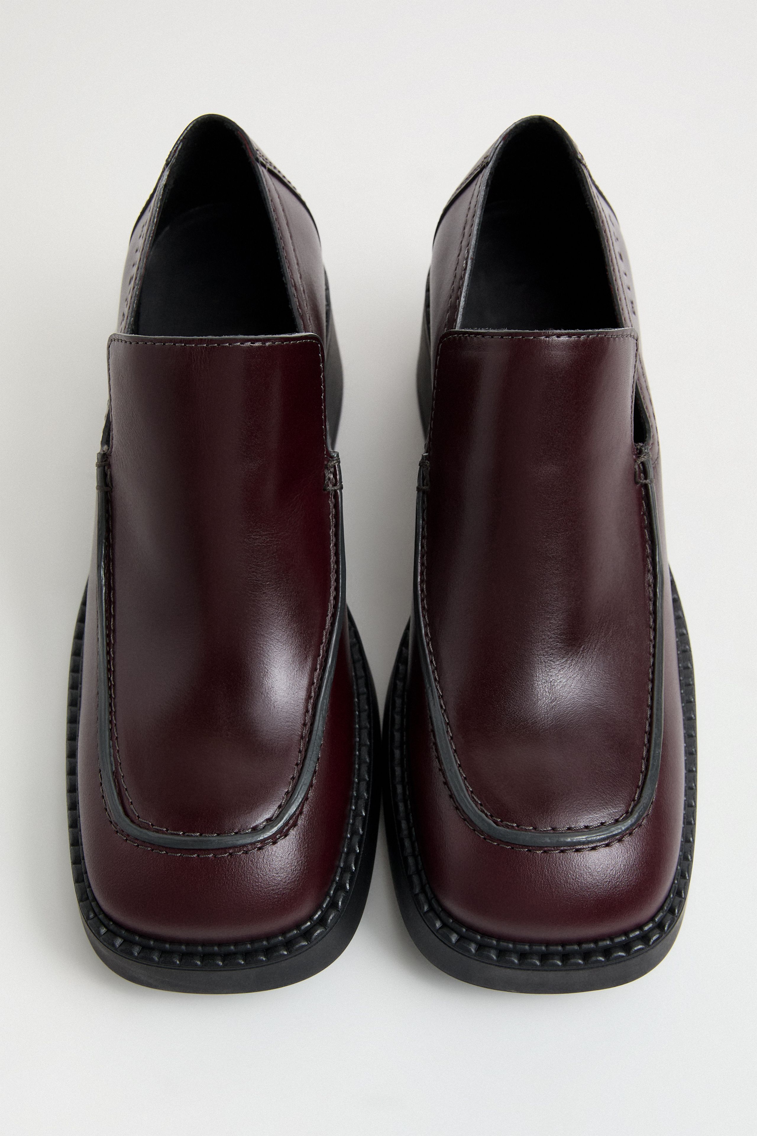 Karion is a refined loafer design. High-fronted, with piping detail on the square toe, it adds height and depth with a robust rubber sole and stacked-effect heel. It's crafted from a shiny burgundy leather with grey contrast stitching.