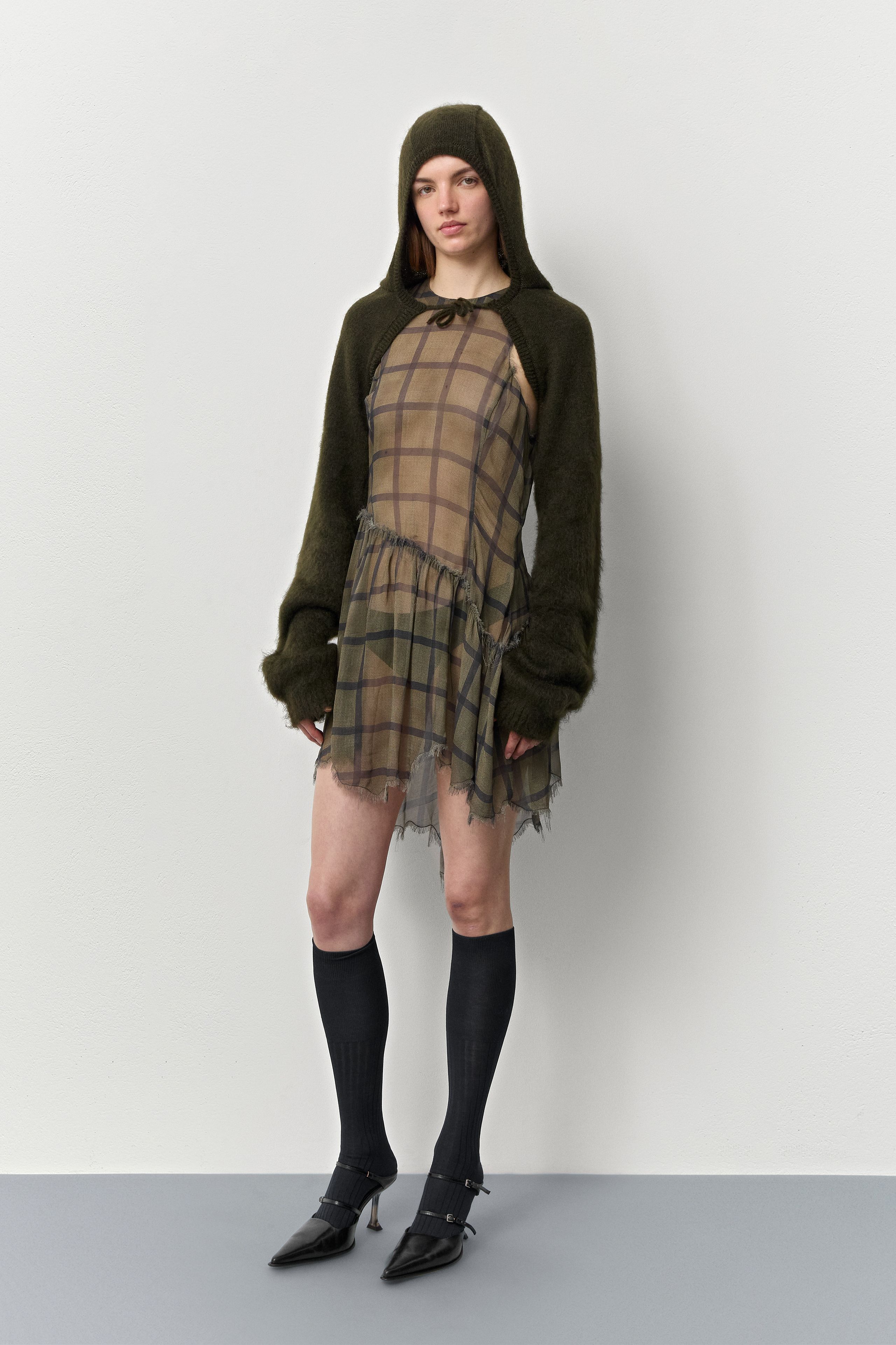 Nivi is a furry styling piece, a front-tie hood and sleeves, brushed to be softer and furrier as you move down the oversized arms. Wearing this is like giving ourselves a warm, hairy mohair embrace. Soft self-love.