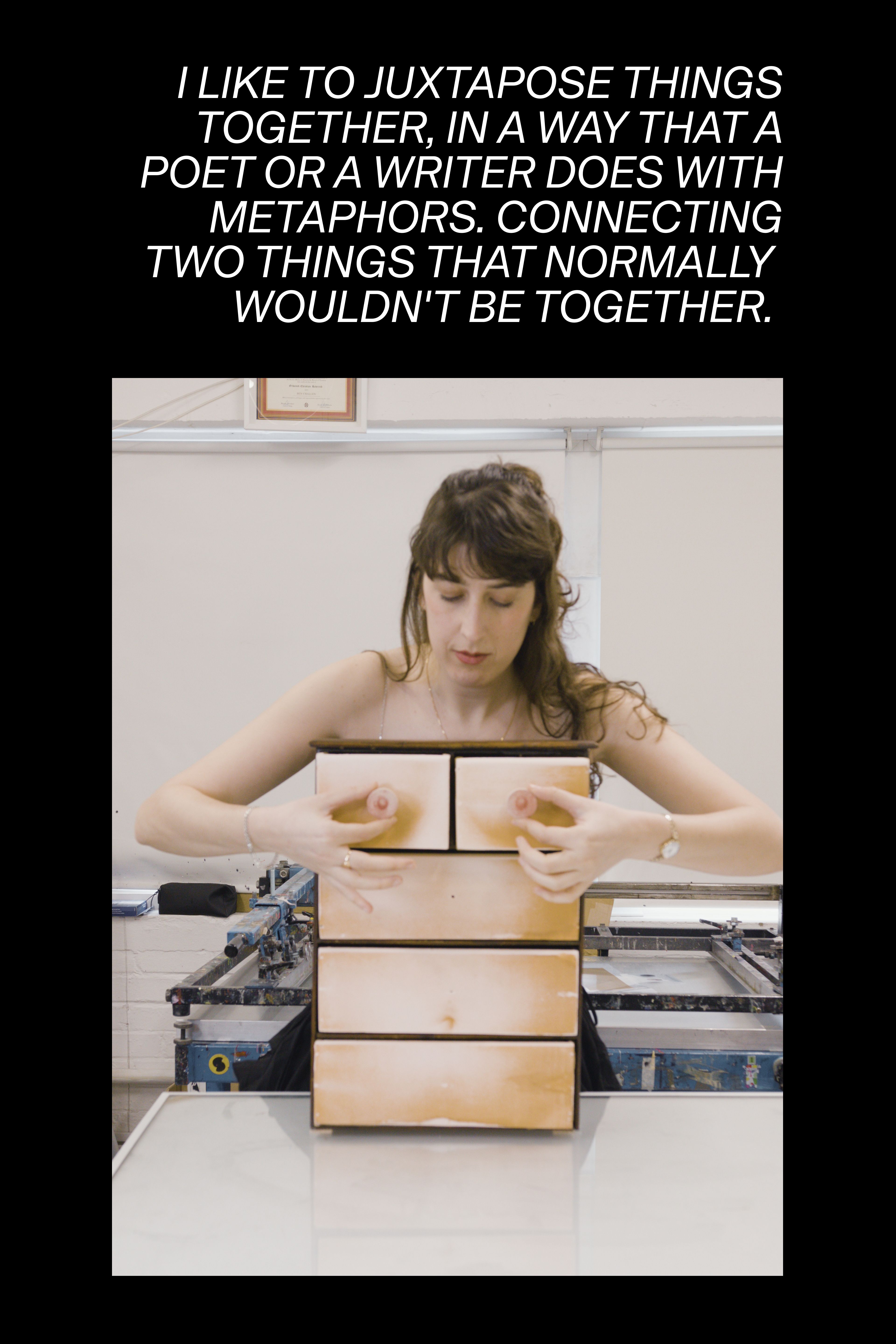 I look at objects or parts of the human body and what they represent or what they are to different people, cultures, to me. I like to juxtapose things together, in a way that a poet or a writer does with metaphors. Connecting two things that normally wouldn't be together.