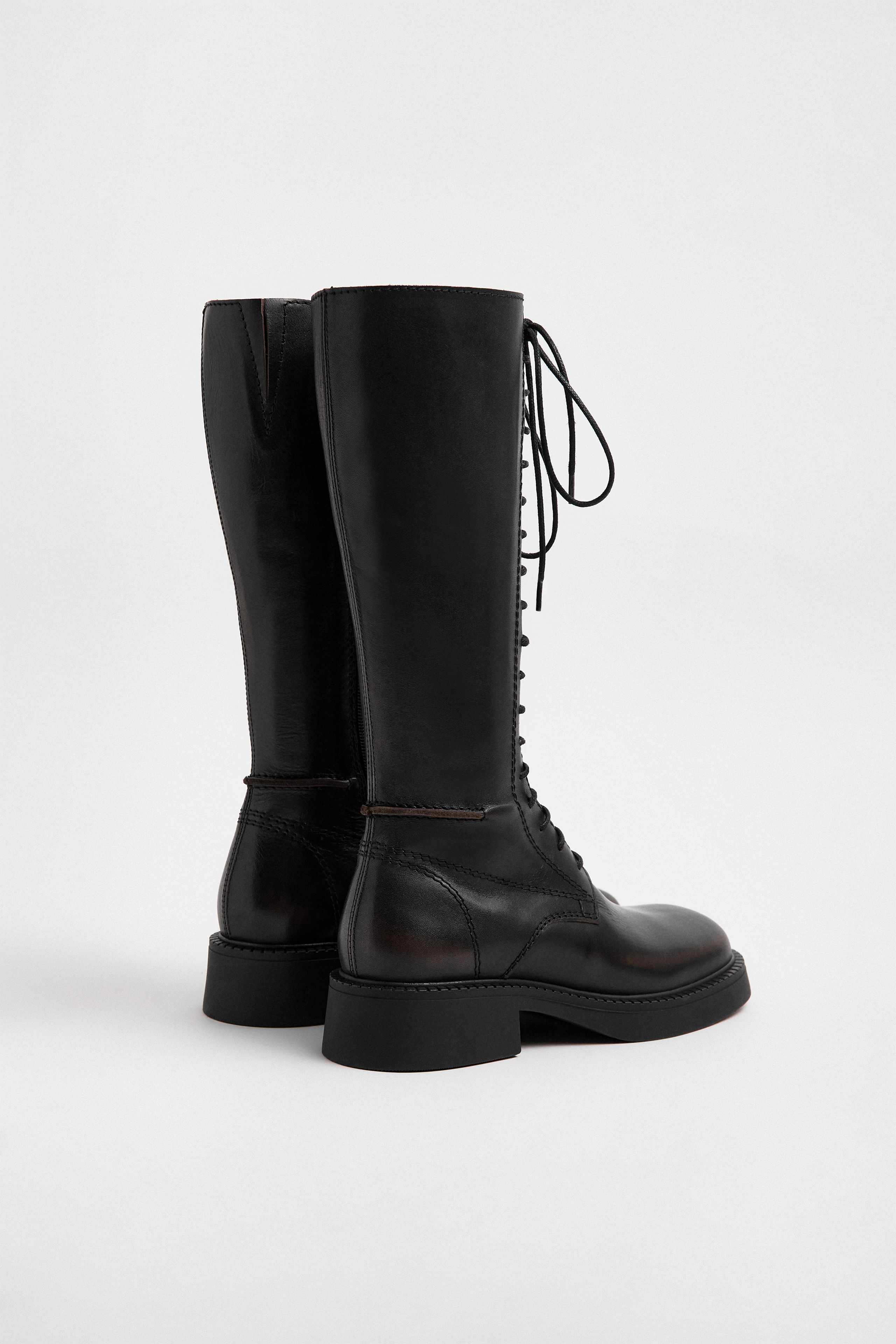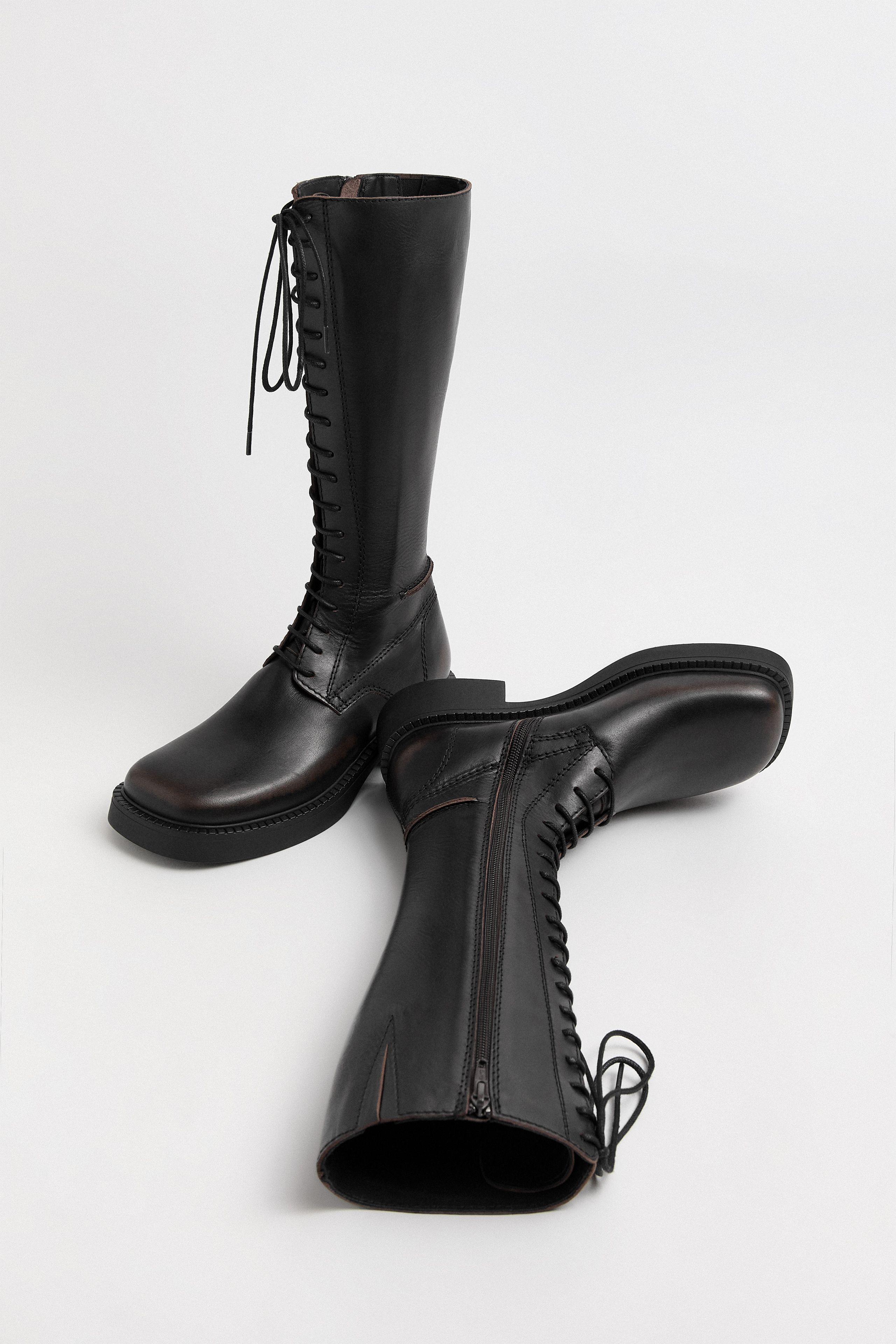 Abrama is a tall, fitted, military-inspired lace-up boot with rounded square toe and heel seam detail. Constructed in a brown brush-off effect double tanned leather which reveals the lighter shade beneath as they are worn, it features a long inside zip and elasticated dart to accommodate for individual fit.