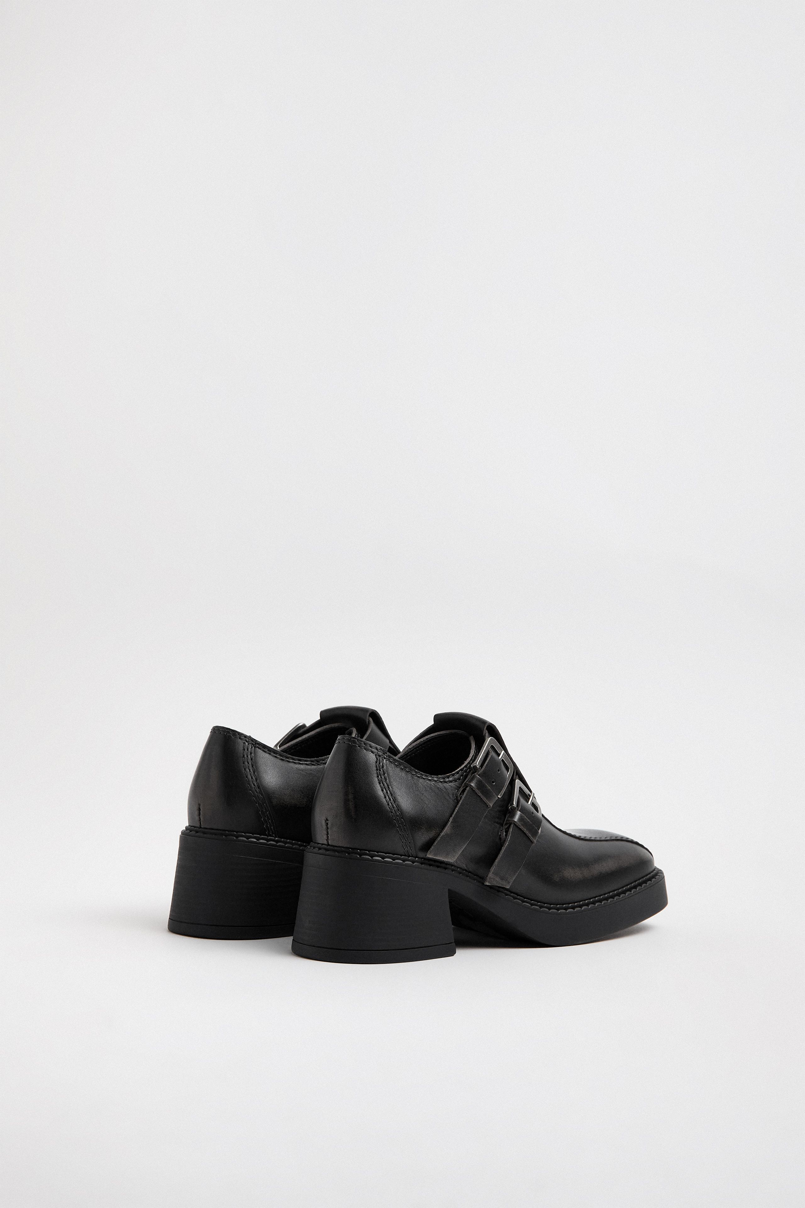 Aurelia is a double buckle shoe with a distinctive stitched front panel design. It features a thick sole and stacked-effect heel and is constructed in brush-off effect double tanned leather with a dark grey top tan and a lighter grey beneath that's revealed as the shoes are worn.