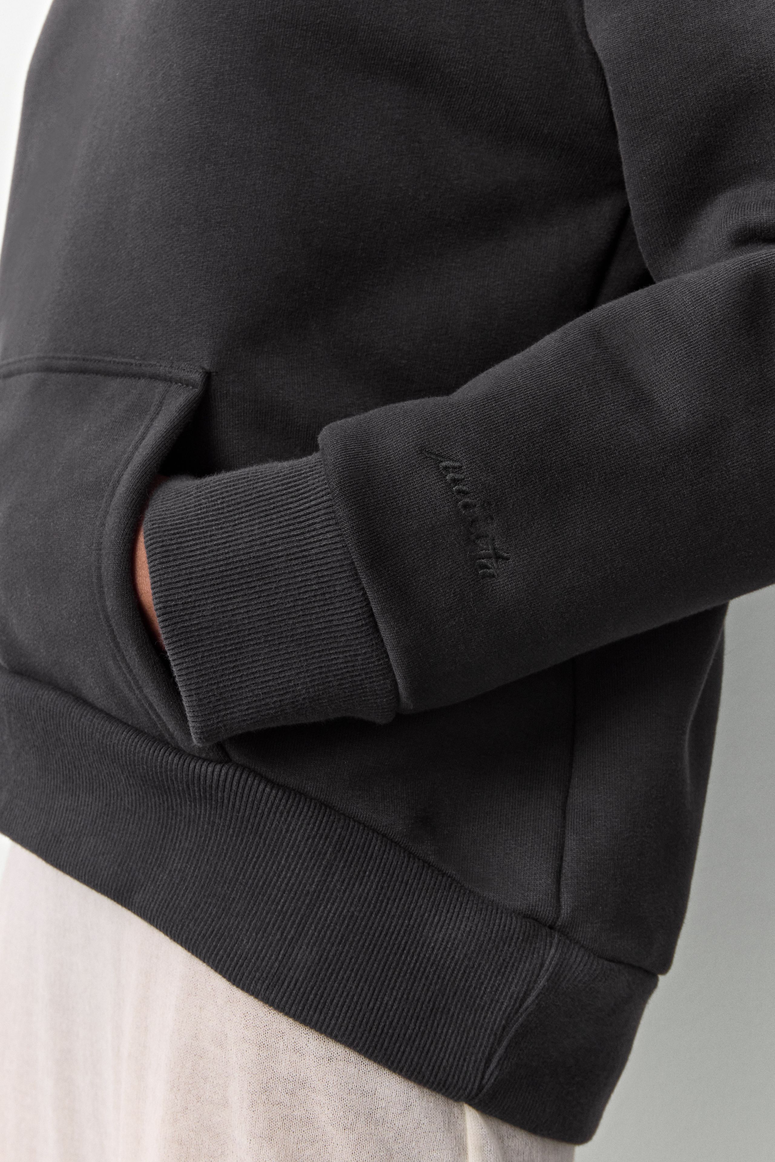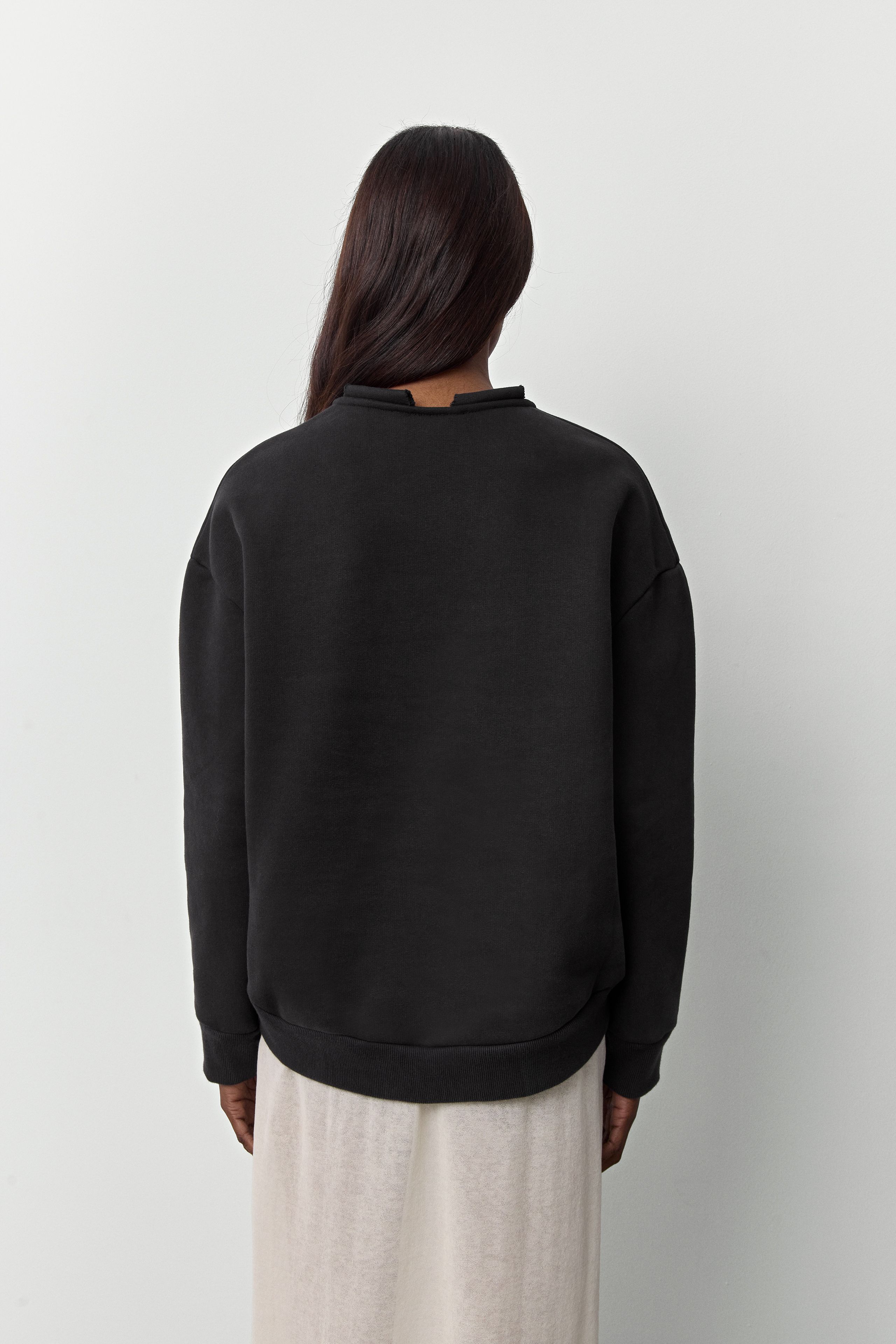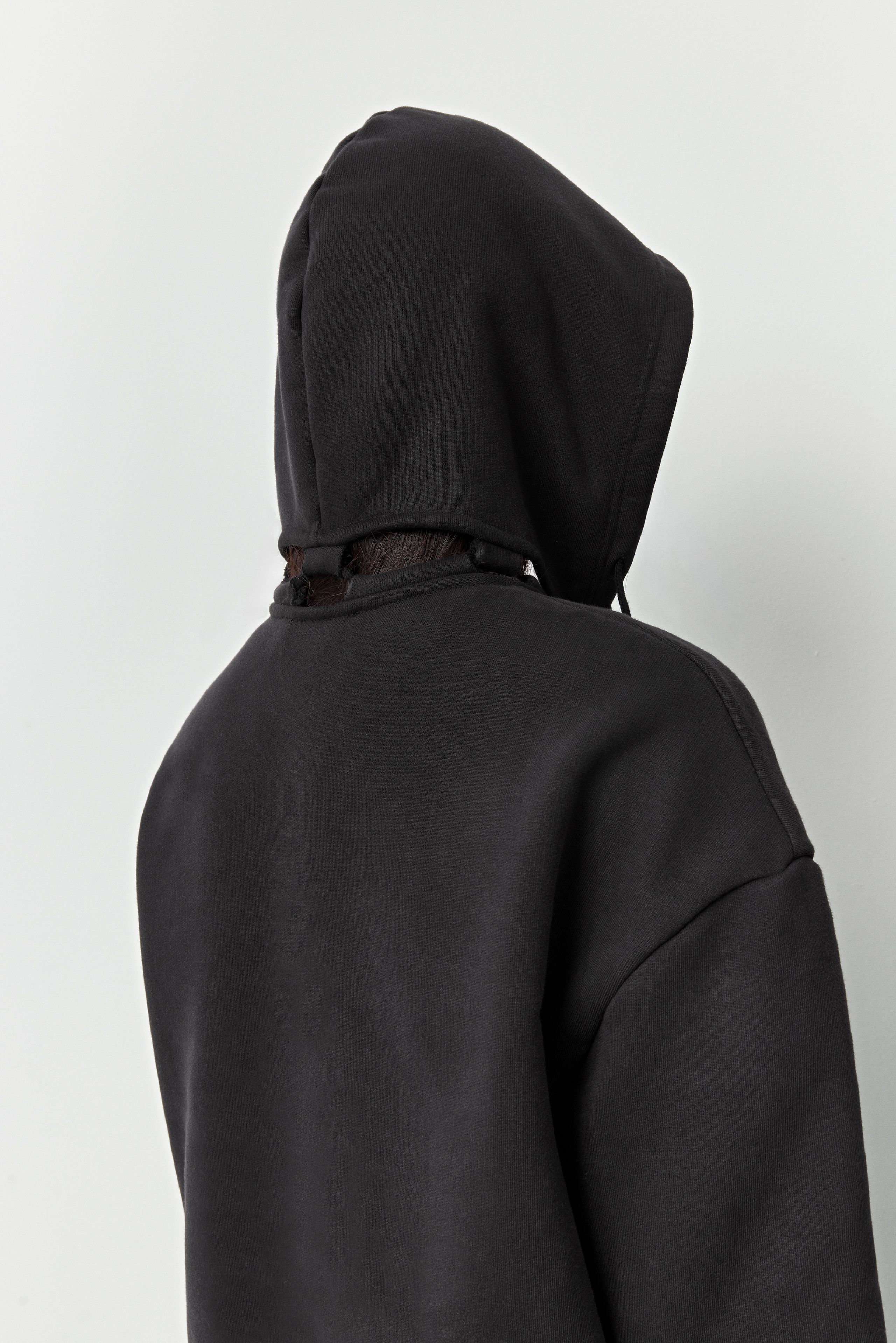 Carly is a double act, an oversized black sweatshirt, with a curved hem and longer than standard sleeves, that can be worn in two ways. Rope-tie the hood on if you’re wanting some incognito comfort or take it off to create a more open-necked sweatshirt style. We like to play this wearable layer, favourites go-togethers include, over the Gaia tartan dress or under the Irne coat.