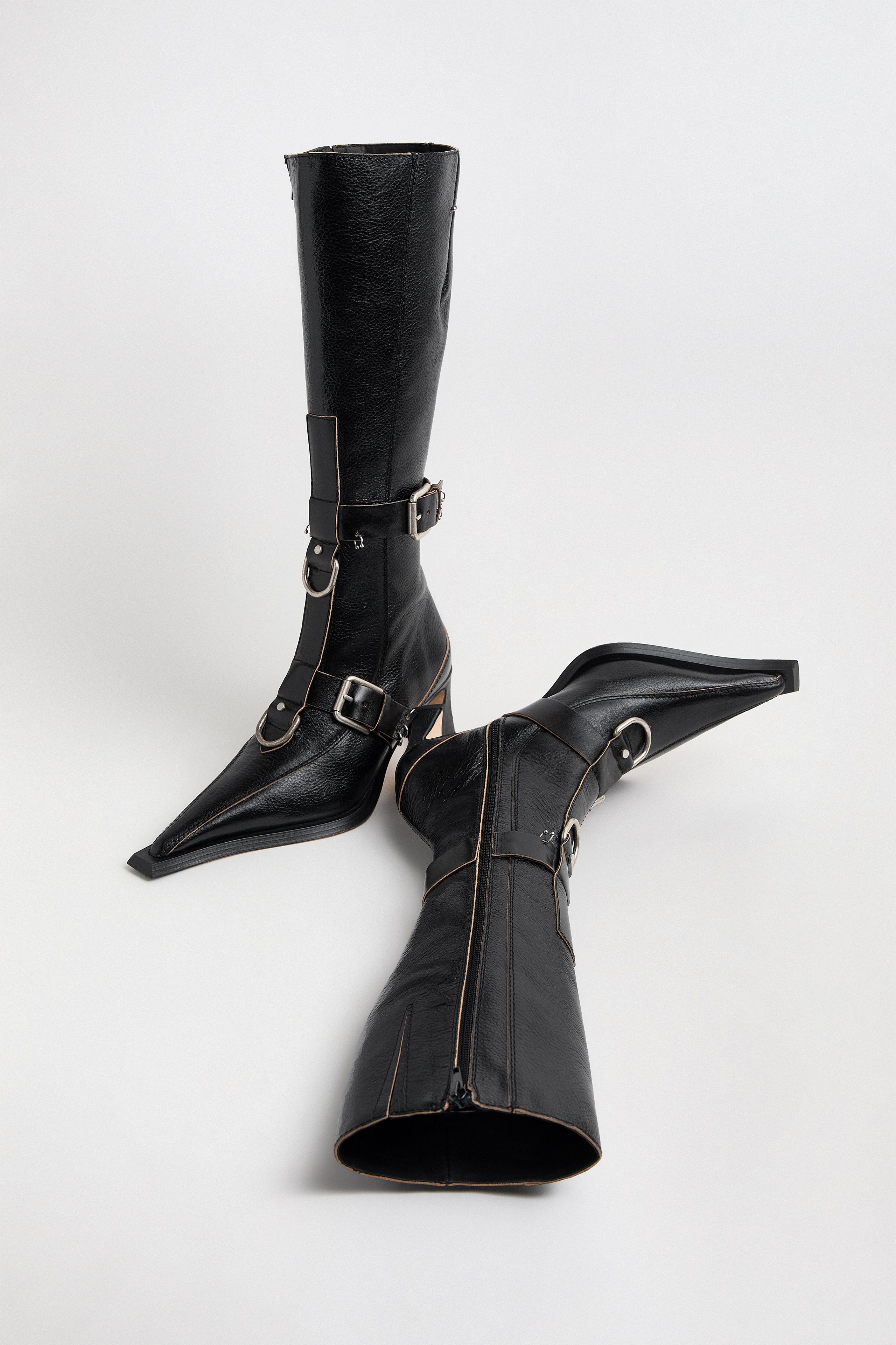 Eliya is a tall, fitted boot with pointed toe, outsized beak-shaped sole and a slim sculpted 6 cm heel. Constructed in smooth black leather with raw edges, it has a distinctive two buckle and vertical strap design, with silver hardware and multiple silver ring piercings for added attitude.