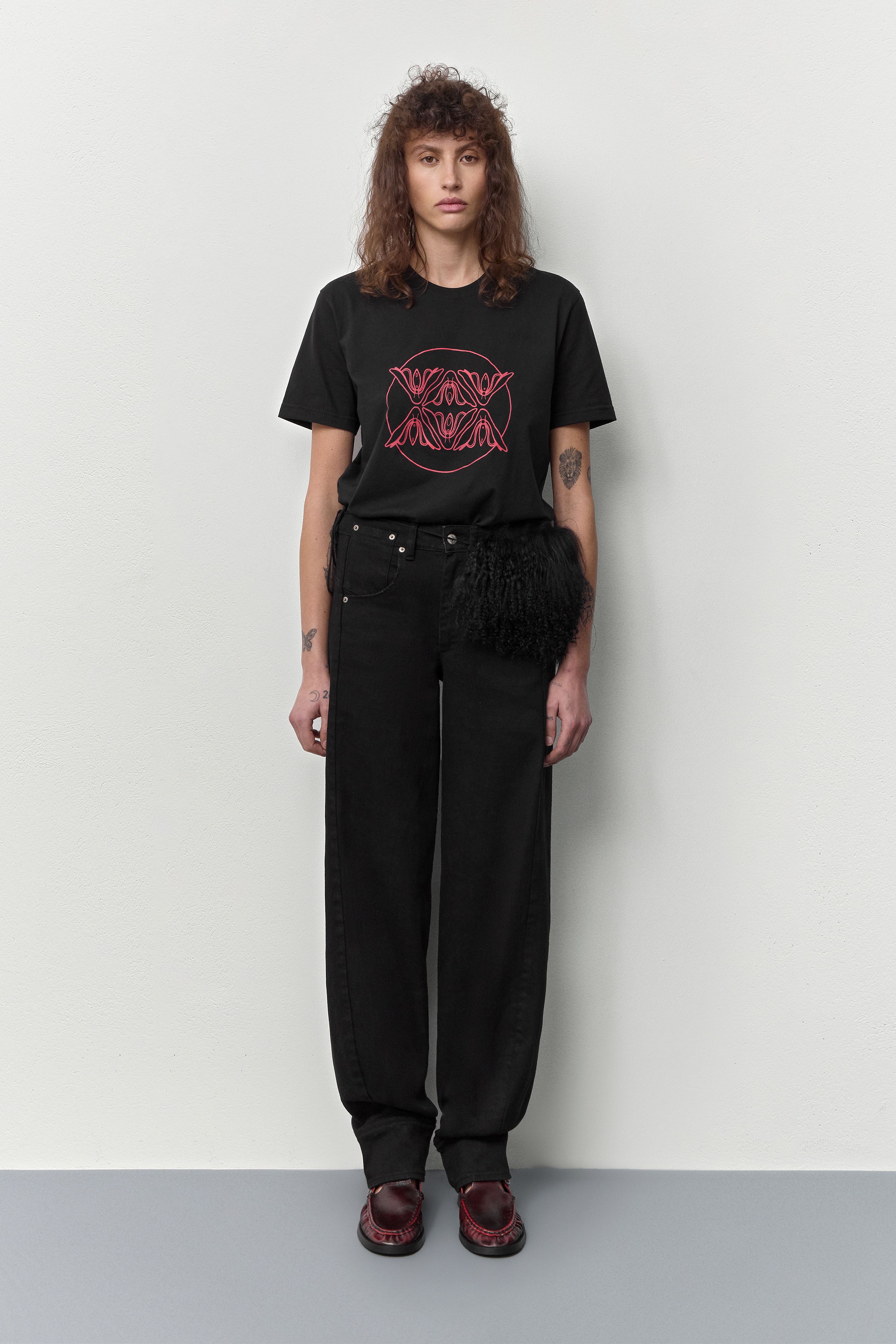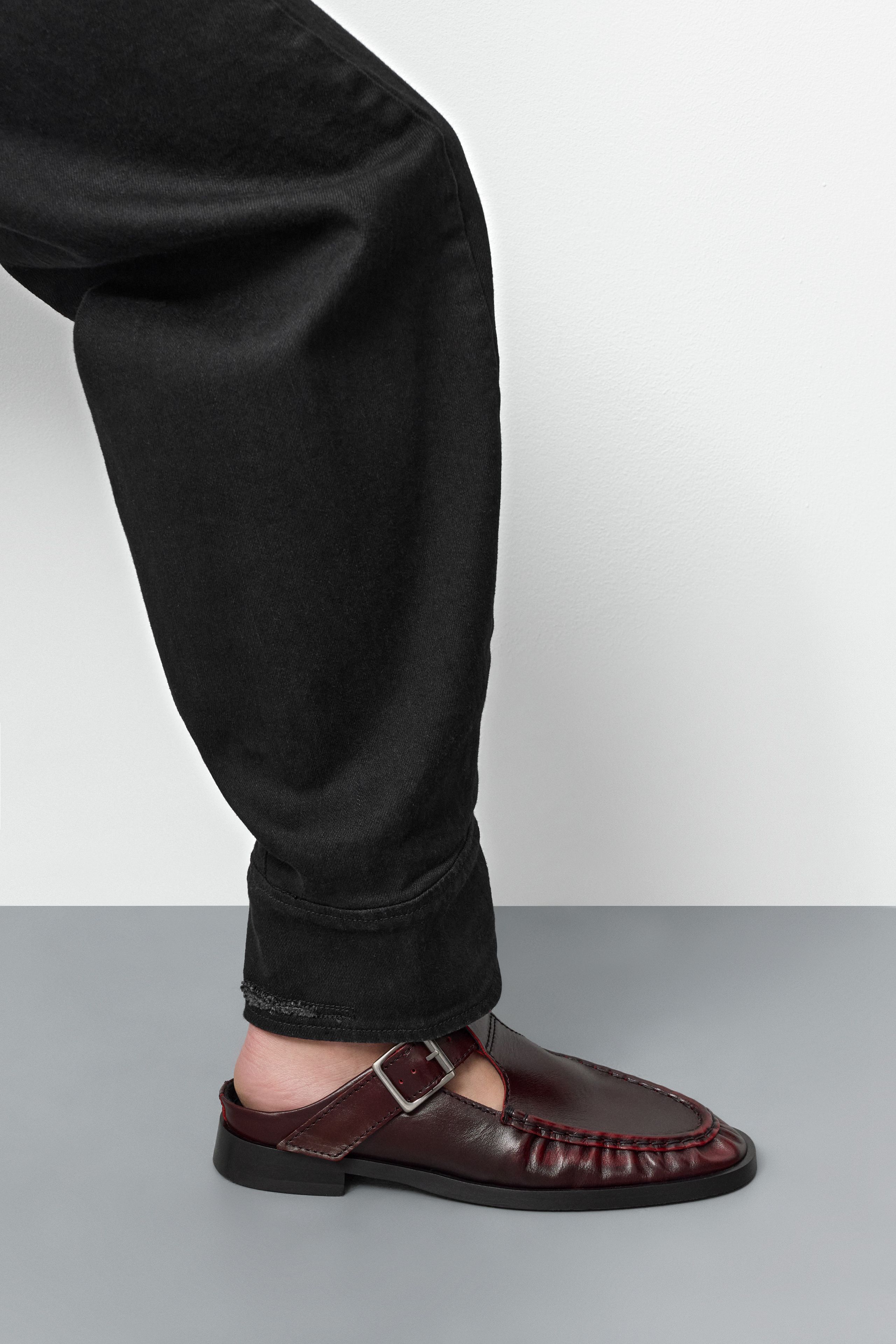 Gianna is a part moccasin, part t-bar mule, with a buckle. Constructed in red brush-off effect leather that's been buffed to reveal a lighter tone around the ruching on the toe, the design has a flat welt with a neat rubber outsole and low 2.5 cm heel.