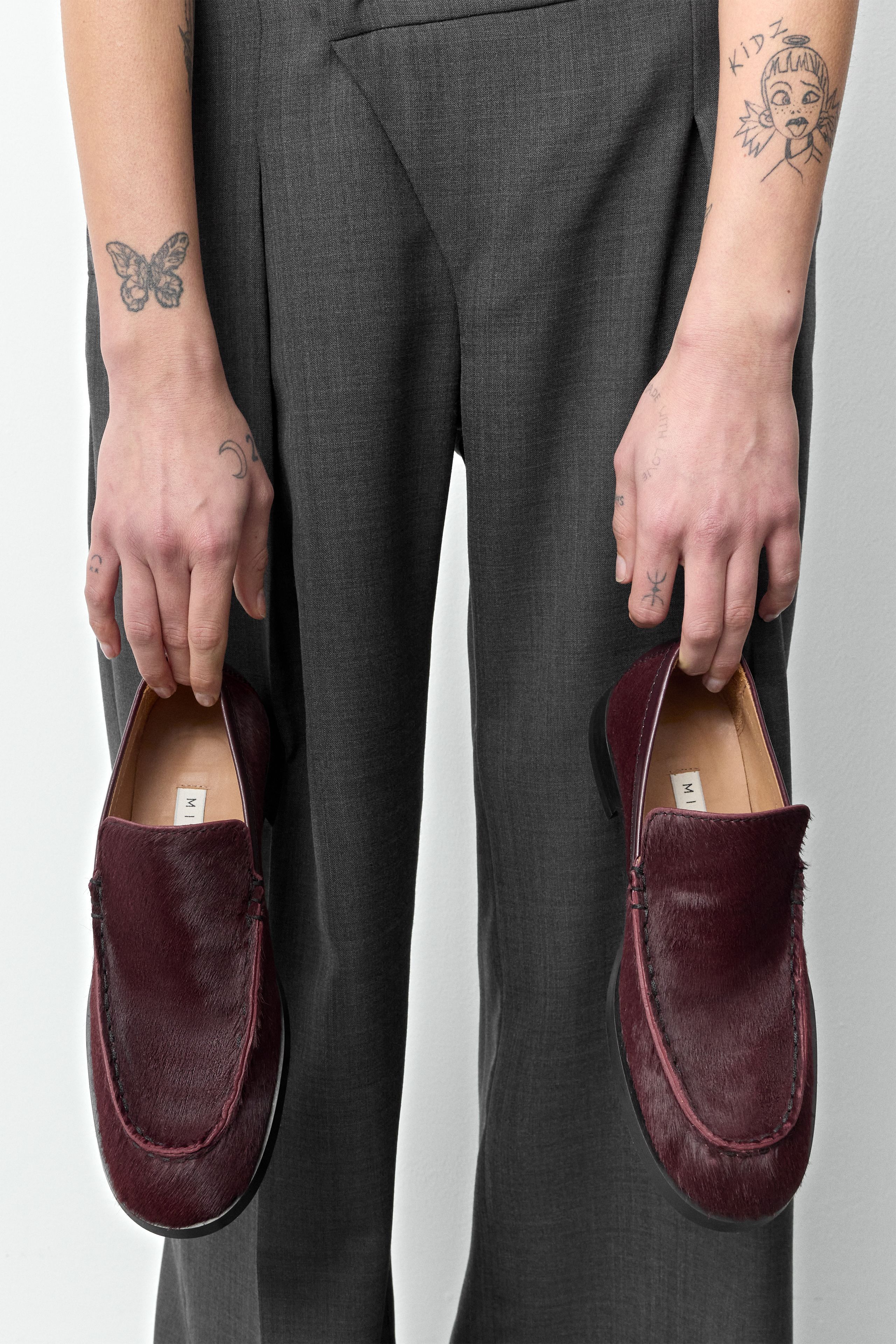 Giobbe is a tailored burgundy loafer with a slim rubber sole and low heel, constructed in a ponyhair fabric with a rounded piped toe panel and tonal stitching around the edges of the shoe.