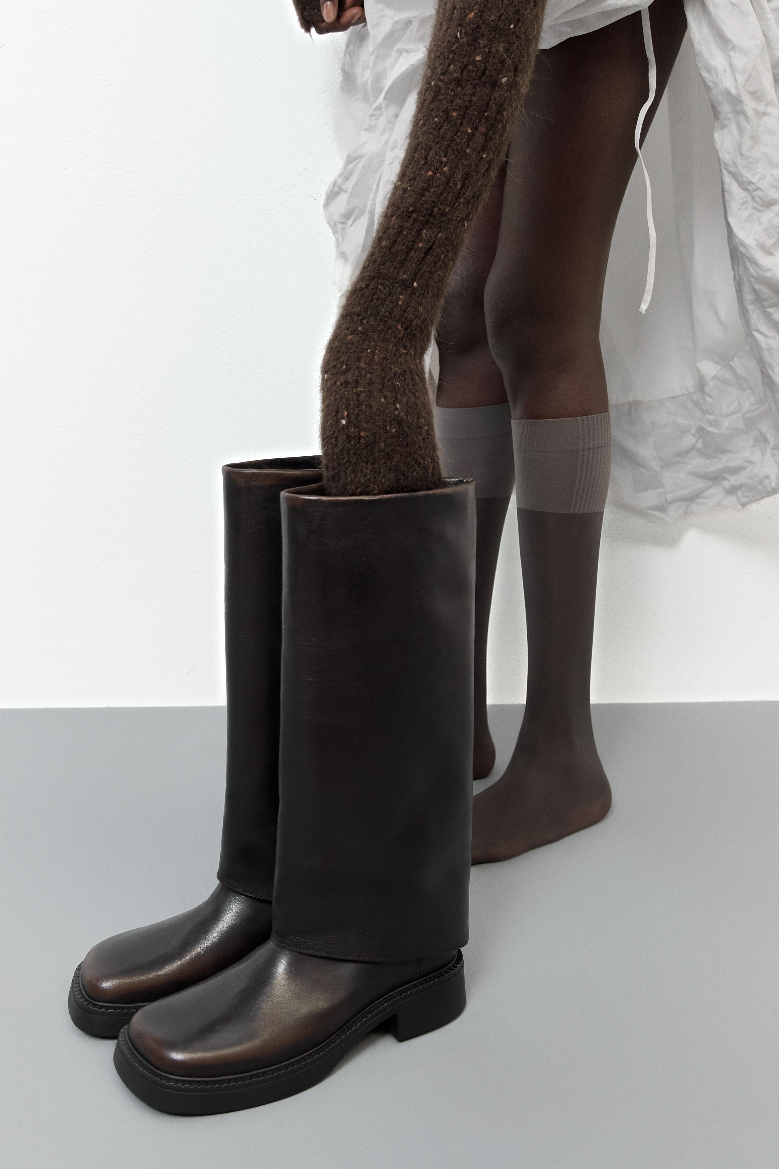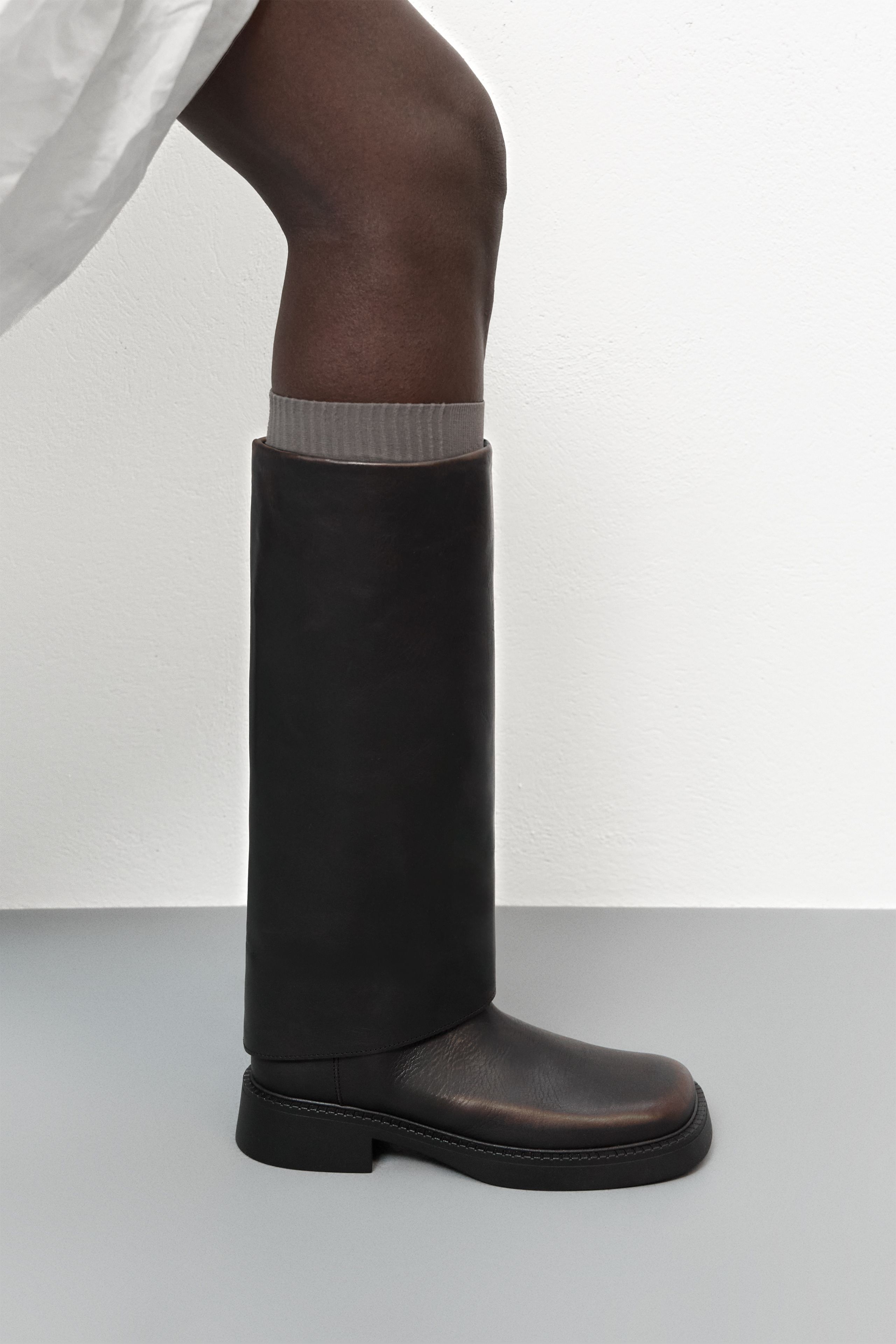 Leala is a tall, pull-on square-toed biker boot with a wide shaft silhouette. It features a stacked effect heel and a robust welted black rubber sole, and its crafted in a brush-off double tanned leather that reveals a distinct patina over time.