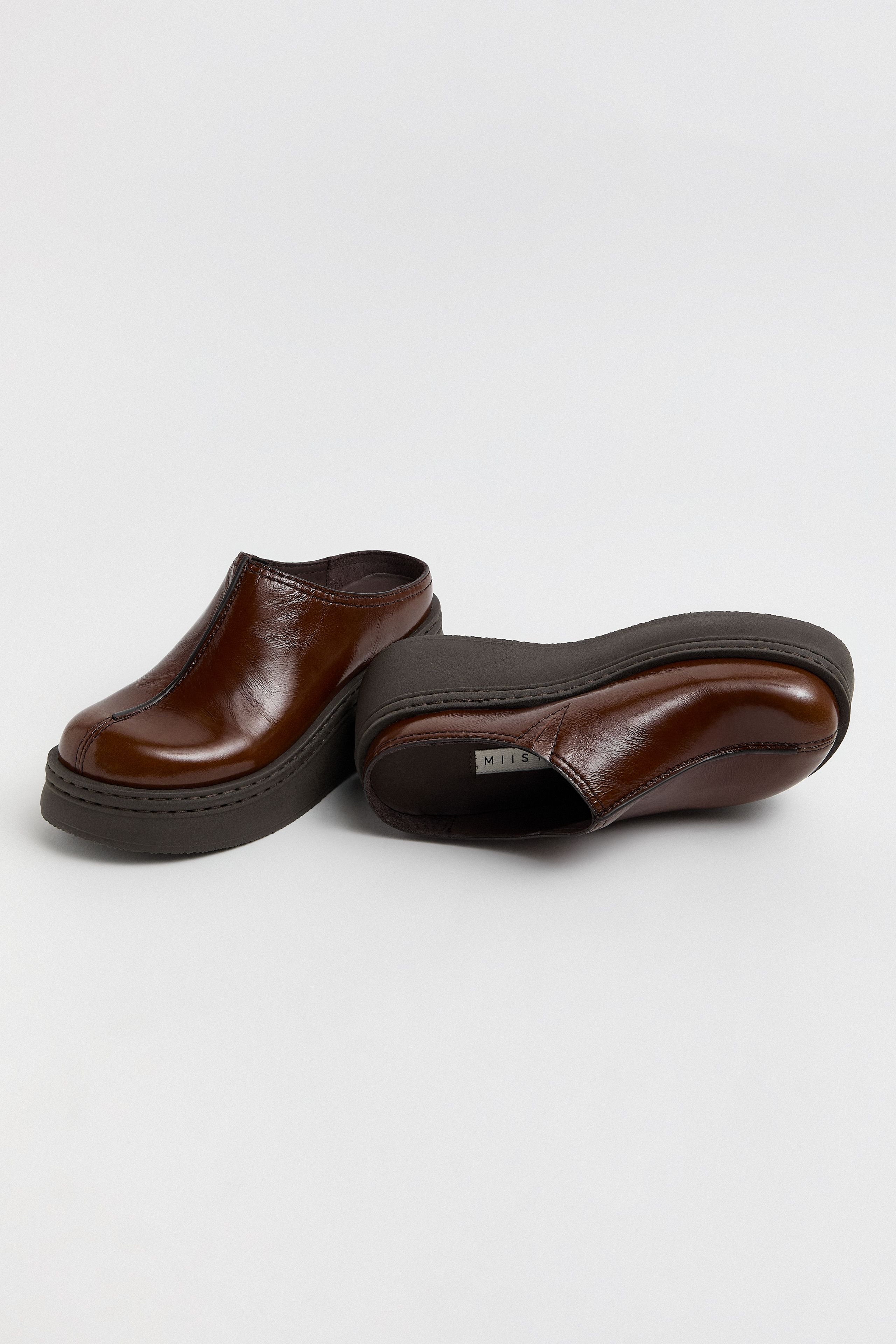 Mego is a high-fronted brown mule in crinkle patent leather that shapes into a low cuff at the heel. The design features a prominent central seam with tonal stitching around a 6 cm rubber flatform sole that gradients to create a subtle wedge effect. The mule also comes with a discreet elastic inner gusset for optimum comfort.