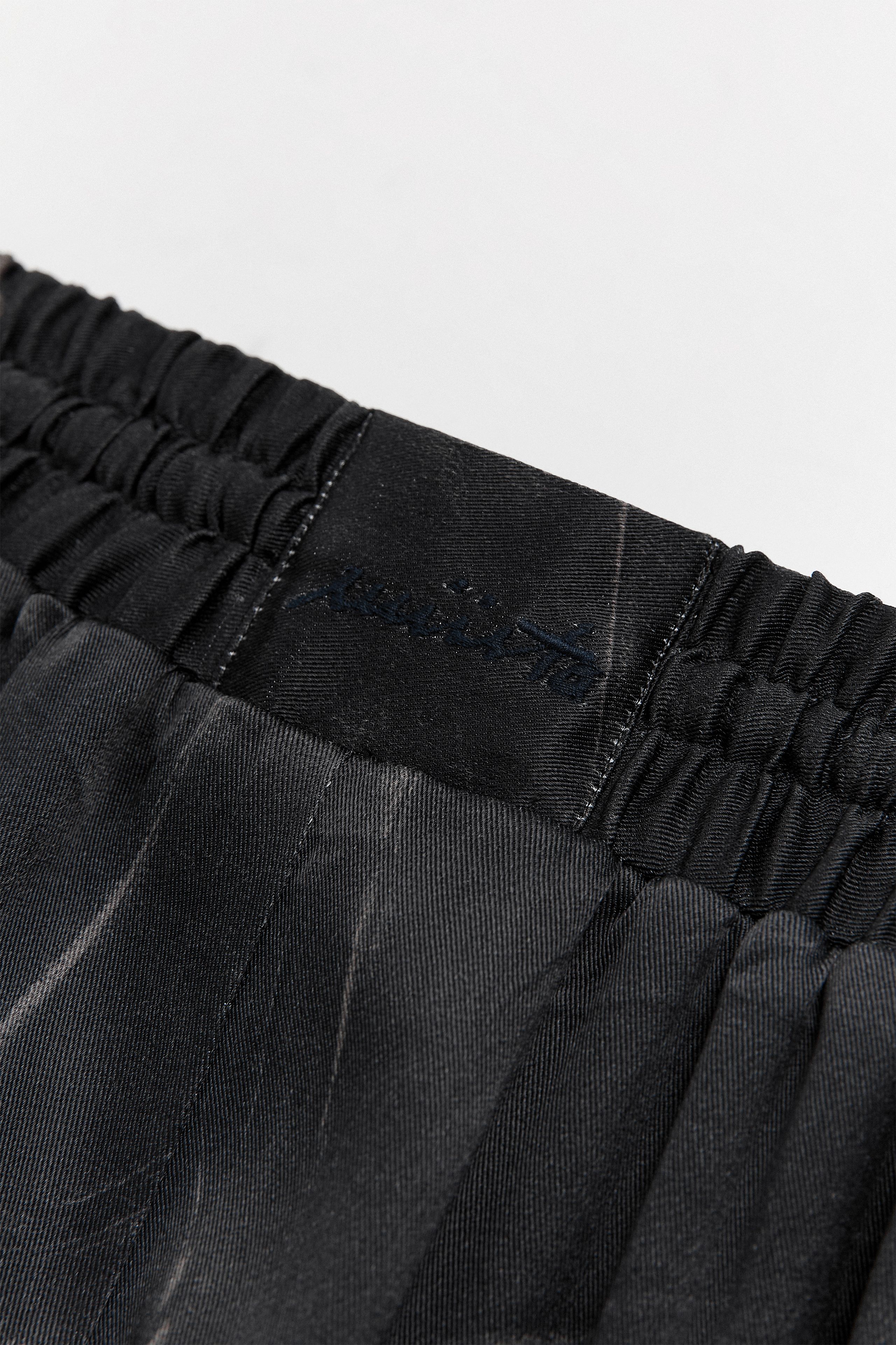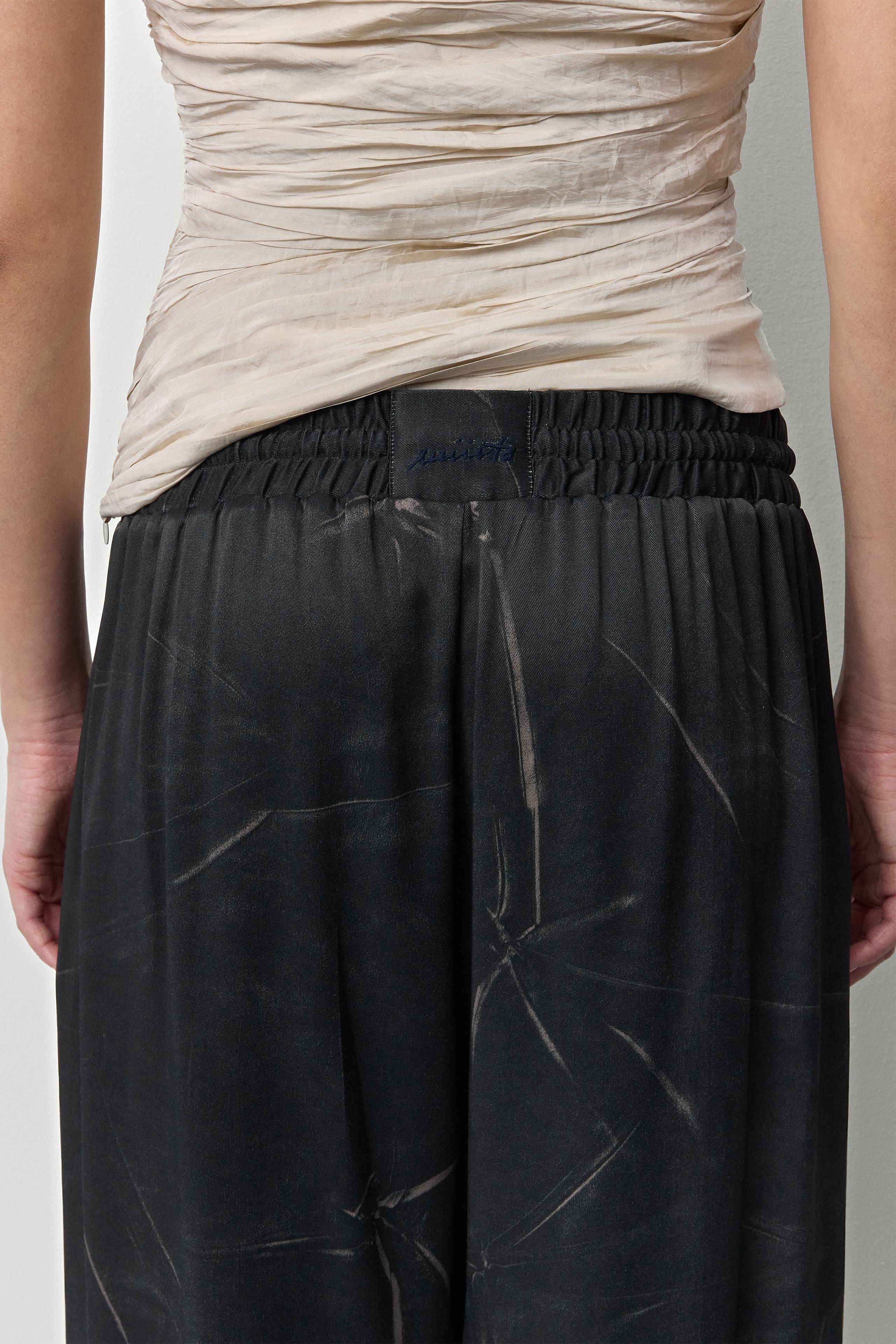 Salix is a fluid, black wide-legged Bermuda short with an elasticated, drawstring waist and raw hems. The material's texture is created by taking a twisted leather skin, digitising it, then printing the pattern onto silky, viscose to create a subtle almost tie-dye effect.