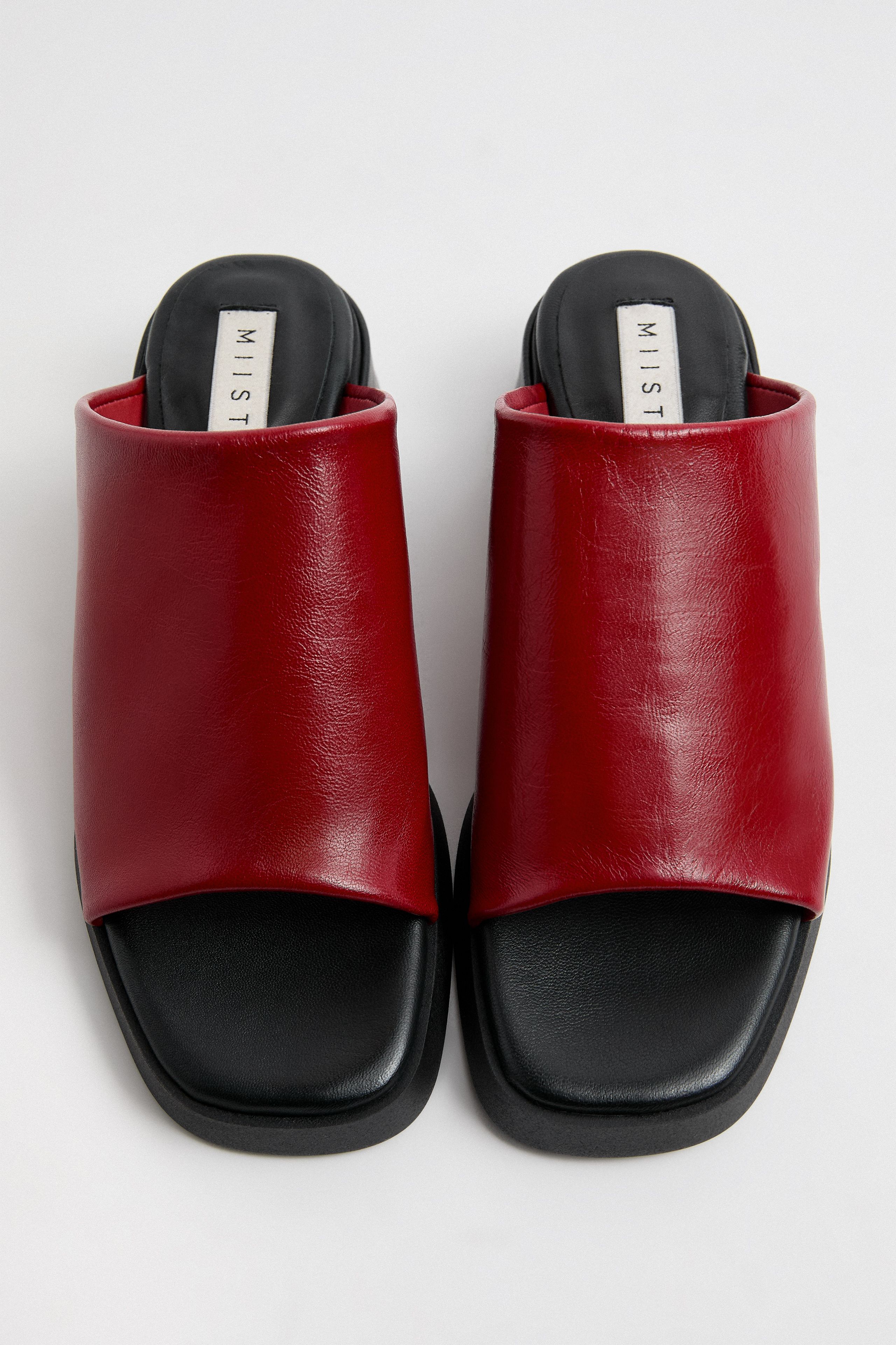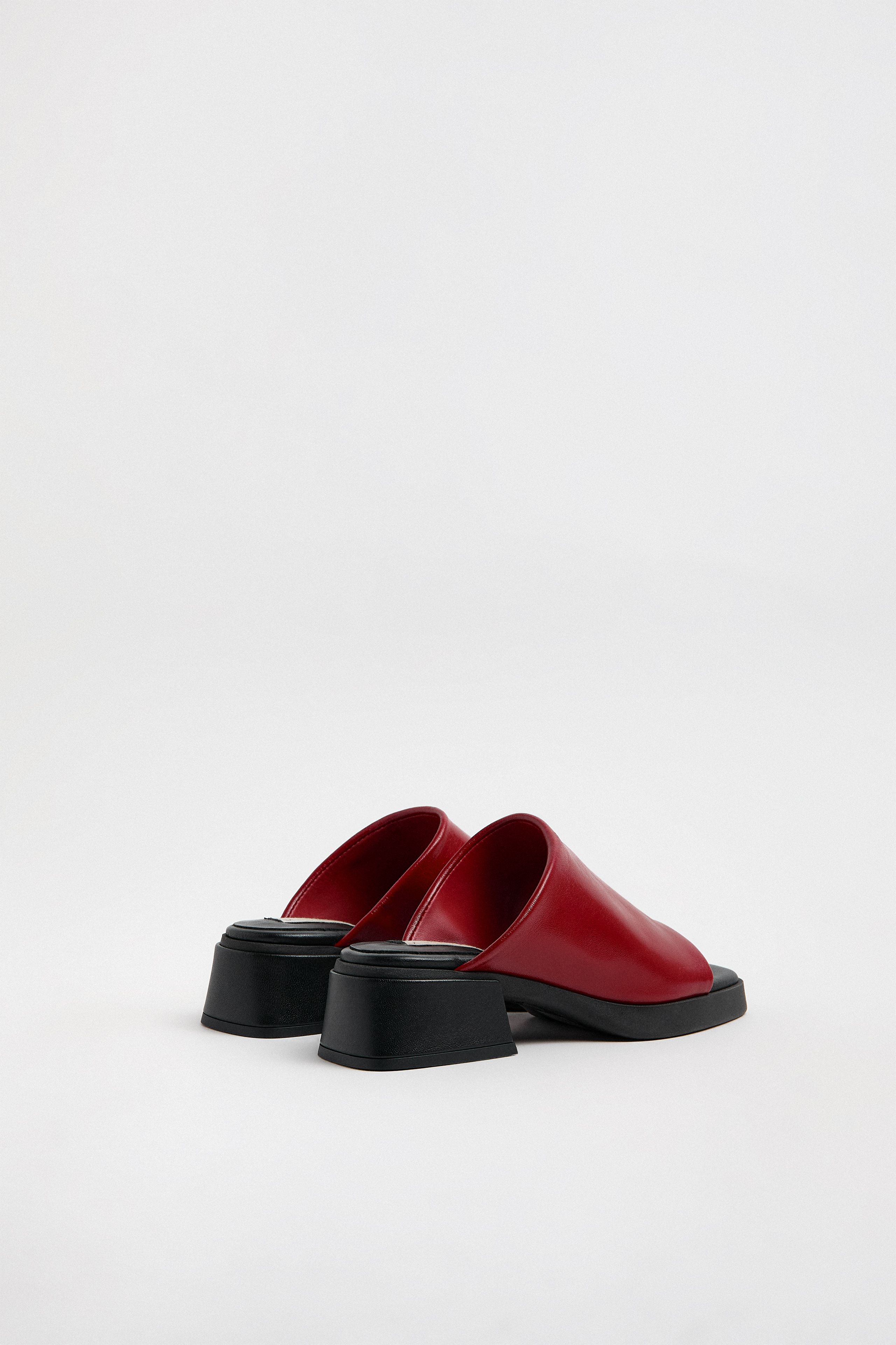 +2Zooey SandalsRed Shiny Leather€205ColorZooey Sandals - Red Shiny LeatherZooey Sandals - Tan Shiny LeatherZooey Sandals - Black TextileSelect sizeAdd to bagSize GuideFind in StoreProduct InfoDescriptionZooey takes a Y2K shape, a sleek open-toe mule in tan shiny crinkle leather with a 4.5 cm flared heel and thick rubber sole.Tan leatherVegetable-tanned cow leather liningUltra-cushioned memory foam padded insoleHeel Height: 4.5 cmMaterialsShipping & returns